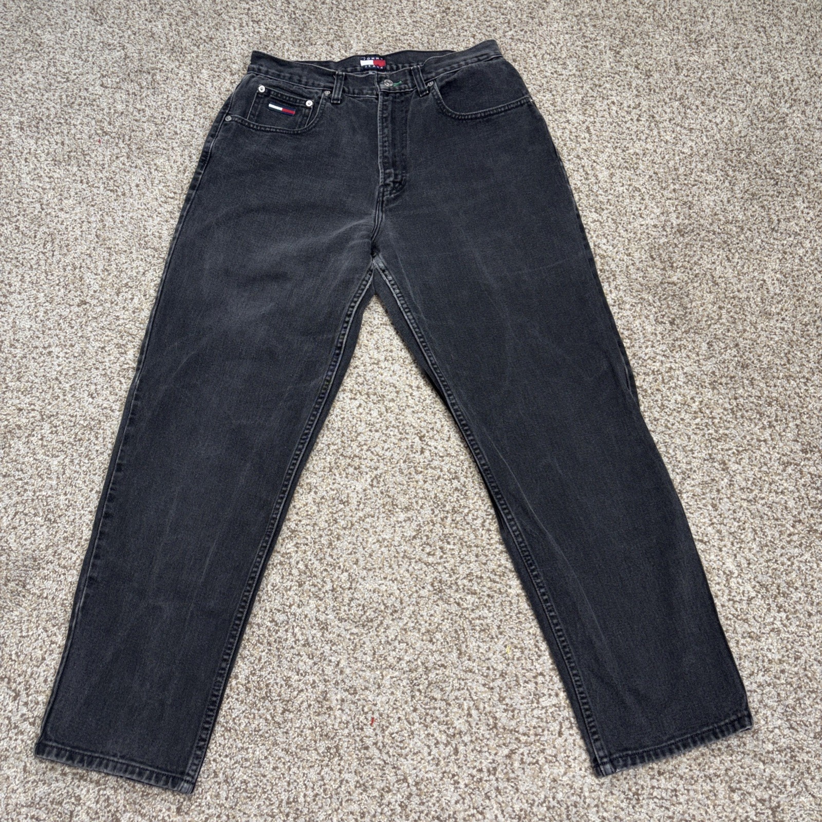 These vintage black jeans from Tommy Hilfiger bring a classic touch to any wardrobe. With a high rise of over 12 inches and a tapered fit, they offer both style and comfort. Measuring 30 inches at the waist and a 29-inch inseam, they're perfect for a laid-back yet stylish look. Grab these gems and elevate your denim collection!